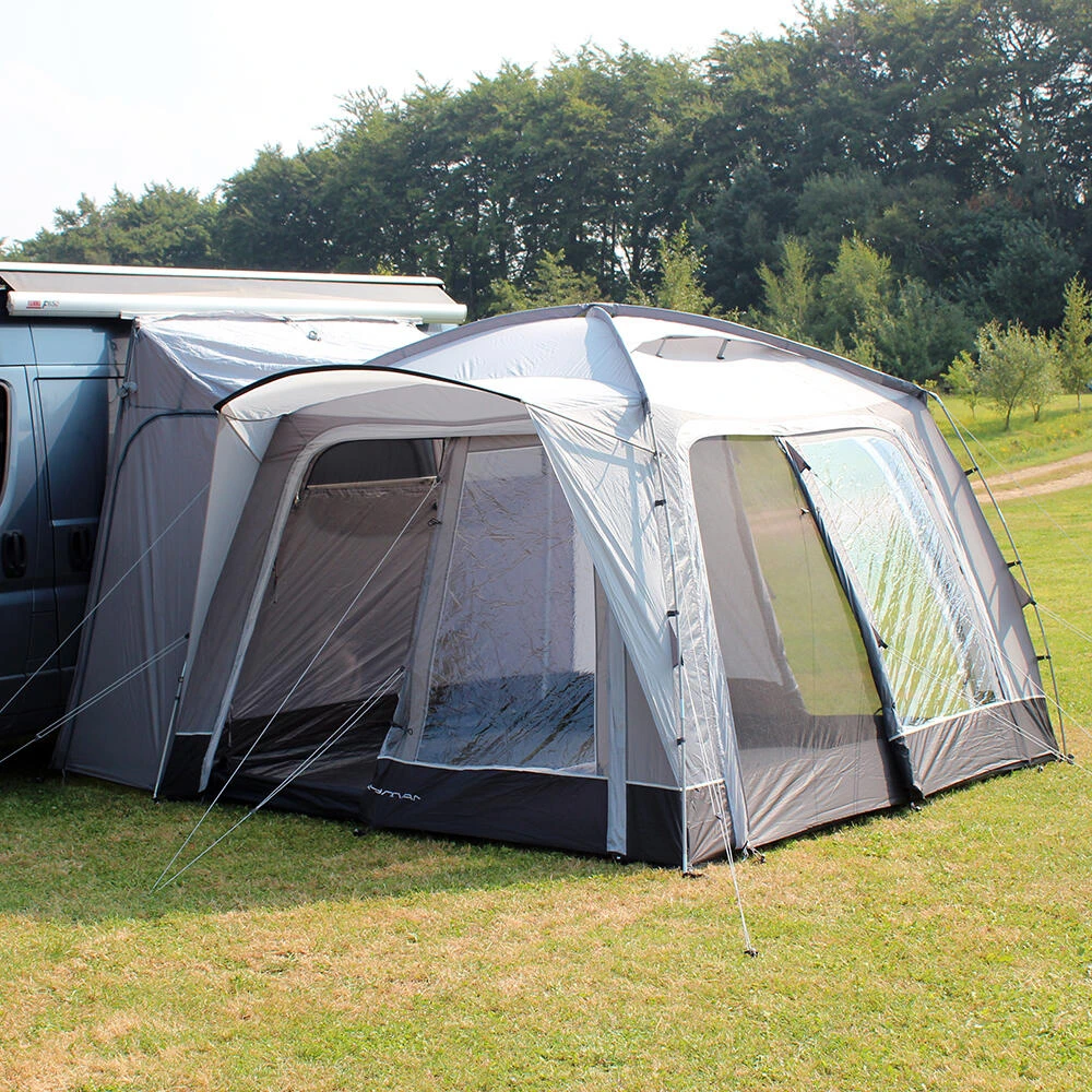 This lightweight pole and sleeve drive-away awning remains the most popular, upper entry-level small family weekender on the market. With just two fibreglass poles used to create the main body of the awning it is quick and easy to pitch, and structurally very stable. The unique design means this is one of the most versatile driveaways on the market, offering access from all sides of the awning through the large roll back doors. Has the option to zip a Cayman Bedroom Annex to the back of the awning, meaning your main living space is not affected if you are looking to add sleeping space. Available in Three ergonomic cowl heights to suit the vast majority of campervans & motorhomes, the Cayman F/G offers unrivalled value for money. Including a ‘fold-flat’ sewn-in groundsheet, and lots of ventilation with plenty of mesh fly screen panels, this is the awning of choice for smaller touring families, couples or independent adventurers, who crave more usable space alongside their van, to meet a budget. Fixing Height 220cm – 255cm (Mid). • 120HDE high density all-weather lightweight fabric
